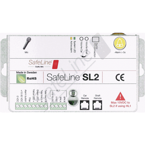 SafeLine SL2 offer full Triphonie (with stations in/below car). It is intended for car top mounting. It meets all the EN81-28 & 70 related requirements and offers flexibility through the choice of peripherals. SafeLine SL2 includes telephone line connections, sensitive microphone and a powerful speaker, emergency call button also for resetting the active alarm and sending maintenance tickets, keypad for programming, supervision of the emergency battery and auto audio check.